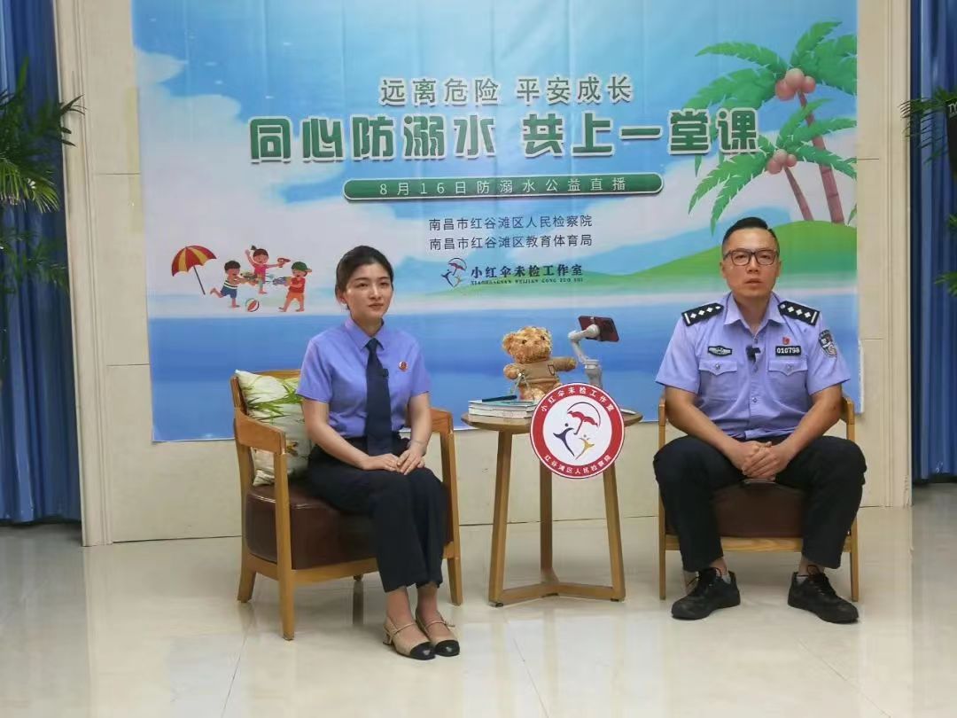 我院未检检察官揭然与红谷滩区沙井派出所王轩民警带着大家一起学习防溺水知识。现场还邀请了三名“小红伞防溺水小小宣传员”代表。