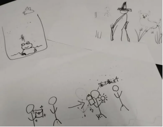 小朋友们两两一组,以井底之蛙、拔苗助长、对牛弹琴、买椟还珠等寓言成语为谜题,进行“你画我猜”小游戏,讲述故事及寓意,小朋友们踊跃参与。