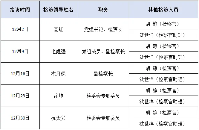 为深入贯彻习近平法治思想,践行新时代检察机关以人民为中心的发展思想,提升12309检察服务中心群众的知晓度满意度,全面推动矛盾纠纷源头化解,积极营造依法有序的信访环境,现将本院“检察长接访日”2025年12月安排公告如下: